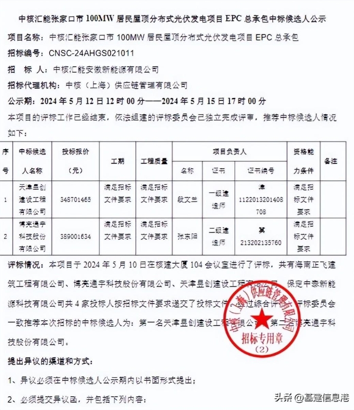 经过激烈的竞争和严格的评审,最终天津昱创建设工程有限公司为第一中标候选人,投标报价为348701465元,博亮通宇科技股份有限公司为第二中标候选人,投标报价为389001634元。
